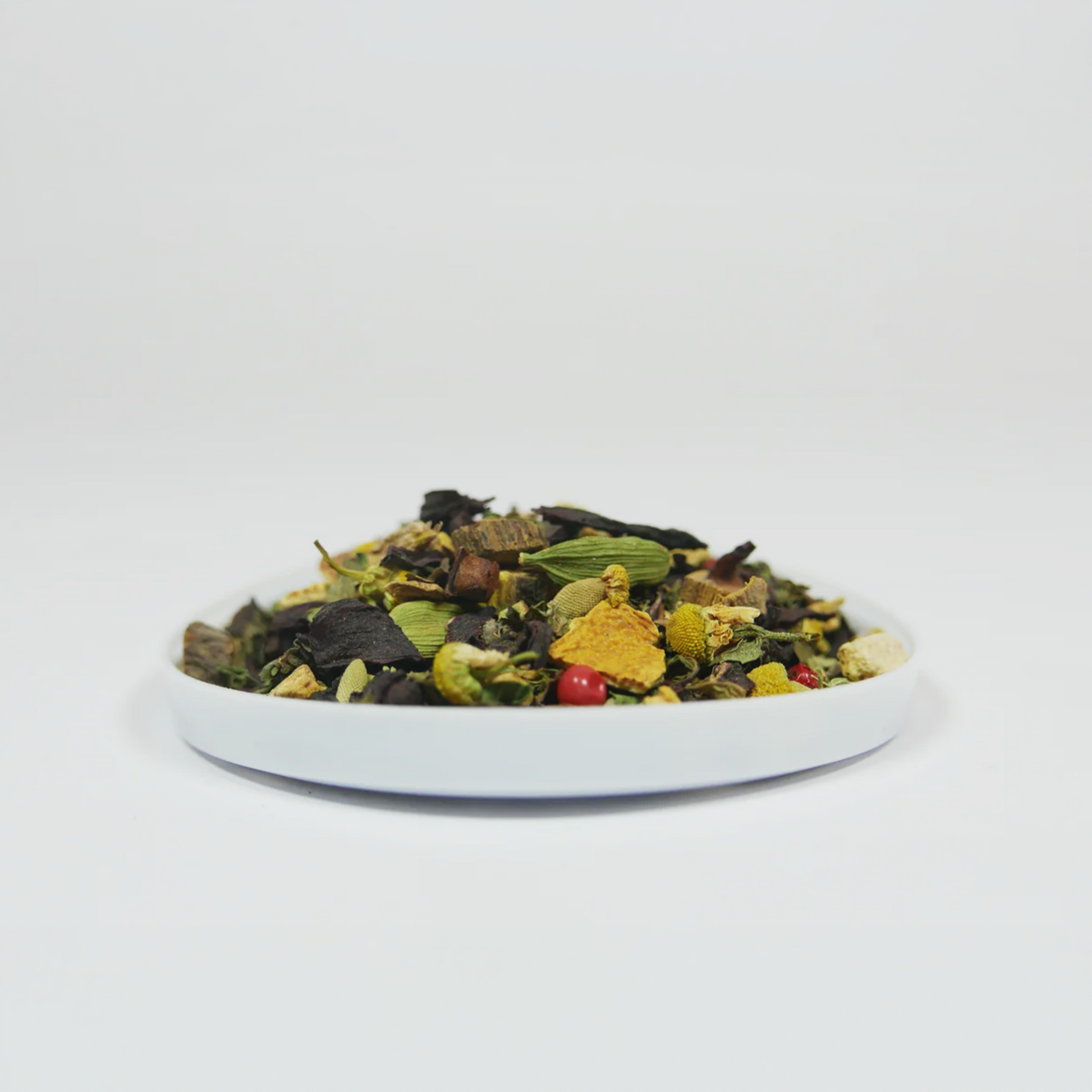 Ingrédients : menthe verte, bâtons de cannelle, hibiscus, racine de réglisse, gingembre, fenouil, écorces d'orange, clous de girofle, camomille, poivre rose, cardamome.